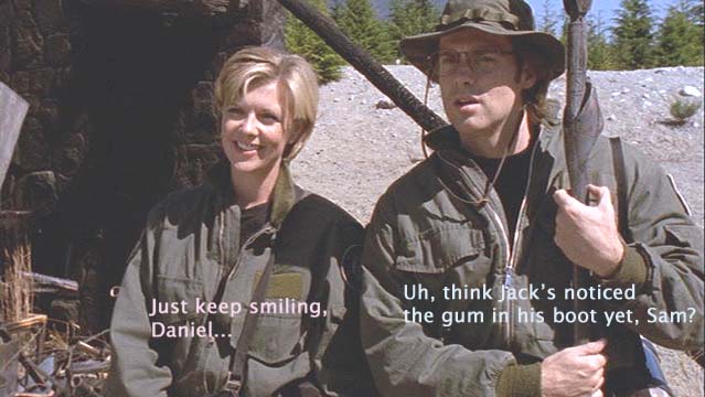 Have you ever watched an episode of Stargate, and at a certain scene, something funny will just pop into your head? Well, I have, and here are the images to prove it - although you can be the judge of whether they're humorous or not (*g*). Click on the thumbnails for the full-size images (each picture opens up in a new window). Hold your mouse pointer over the thumbnails for a little explanation. If you have any that you'd like to contribute, please send them to me. Enjoy! ![]() ![]()