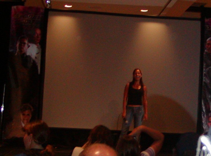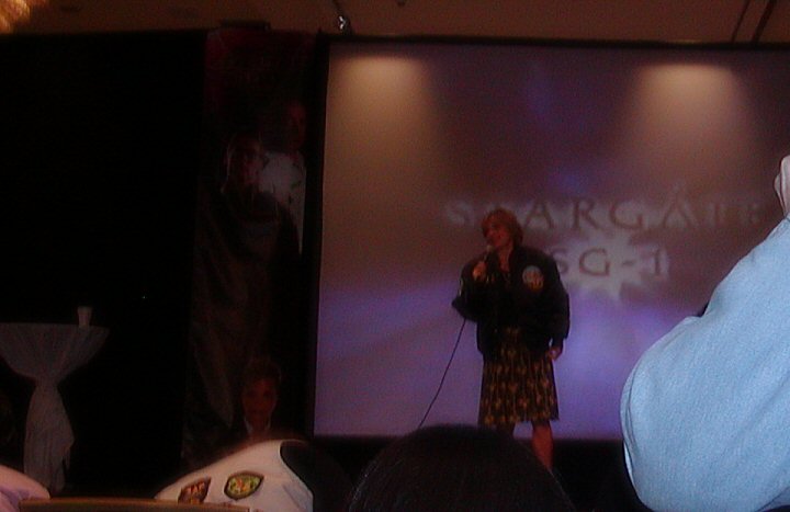 Up after that was TR and she was just so funny and lively, really full of energy and she seemed to really love being there. She opened saying that she had just seen someone there (at the hotel I guess) and they said “Look, it’s Janet Fraiser! They killed her off and she doesn’t know how to do her hair!” Then she posed for a photo op and let us all take pictures of her, even us poor souls who sat way in the back, and Creation Lady (the one with the red hair) didn’t stop us surprisingly. One girl got up to ask her a question and said, “You will be missed. That other lady’s [the new doctor] just not cutting it.” TR said, “I’m sorry to hear that.” She said she couldn’t understand it, that Daniel was suffering from all this radiation and he turns all beautiful and glowing like Oma Desala, and Janet is lying with her eyes wide open and a gaping wound in her chest. She said, “They named a kid after her, big deal!” She was hilarious.